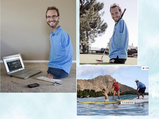 “海豹人”尼克·胡哲通過難以置信的勇氣、智慧的頭腦、對生命堅定的信仰、風趣的幽默感將自己的克服困難的故事傳遞給大家,最終成為一名勵志演講大師 。(舜網評)