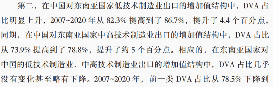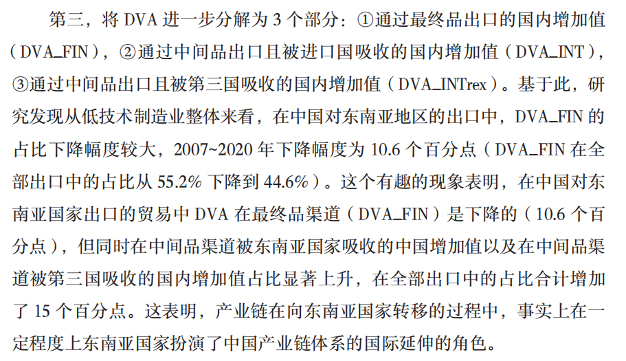 翻譯一下就是:中國出口到東南亞加工的產品,更多又轉賣給了第三國,而在整個轉口貿易中,中國拿了利潤的大頭,而且有越拿越多的趨勢