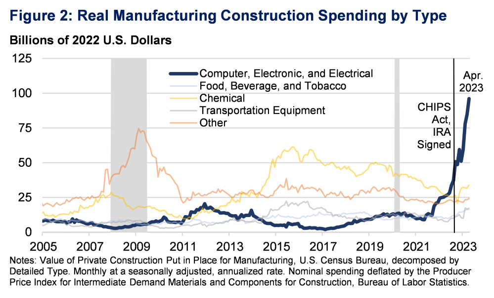 最初,被再工業化口號折騰麻了的學界和輿論界都不認為拜登能有什麼不一樣,甚至抱怨民主黨在高通脹情況下還想通過大規模花錢“削減通脹”。直到2023年,市場觀察家們突然發現:美國再工業化,難道這次大的真要來了?