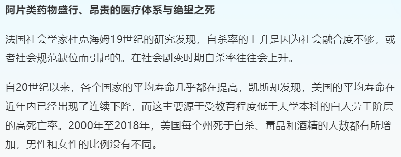 好日子從70年代開始崩塌。先是日本韓國東南亞,然後是中國,美國依靠對全球資本流動的控制權,不斷把工業產能“搬運”到成本更低的發展中國家,然後印刷綠紙買回廉價製成品。雖然目前美國仍握有民用大飛機等一部分尖端製造業,但破爛的州際公路、含鉛量極高的自來水管、底特律的鬼城、嗑藥和自殺率節節攀升的白人藍領,全都宣告了美國作為工業國家的崩潰。