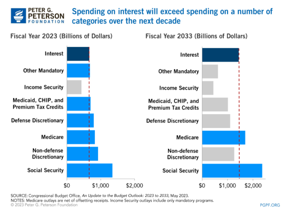 政治上,雖然半導體和基建投資是兩黨共識,可針對新能源產業的補貼是共和黨的眼中釘肉中刺,一旦白宮或者國會在2024年大選中易主,新能源產業必然面臨斷奶。經濟上,美聯儲的高位利率疊加海量國債,聯邦政府的國債付息支出一路飆升,帶動國債總額不斷滾雪球。未來兩年,隨着付息支出割開美國財政的動脈,美國還有能力繼續給企業輸血嗎?