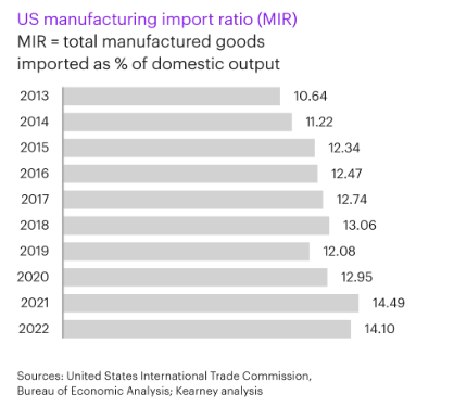 從其他宏觀數據看,美國製造業也遠遠沒有呈現出勃勃生機、萬物競發的場面。7月,美國製造業PMI連續第9個月低於榮枯線,製造業就業萎靡不振。2022年,美國進口製成品價值佔到國內總產值的14.1%,仍處於歷史高位附近,考慮到製成品相對美國國內的金融、法律和醫療過於廉價,14.1%意味着美國對海外製成品的全方位依賴不降反升。