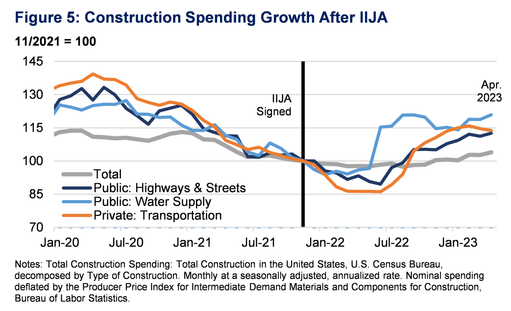 美國財政部還放出了另一張圖,或許可以起到一定參考作用,使用建築物料價格指數平減整體建築投資,原本增長的數據趨勢(下圖藍線)從增長轉為下跌(灰線)。雖然整體建築投資和製造業建築投資的口徑差別很大,但我們合理推測,**如果用涵蓋所有成本的價格指數平減,烈火烹油的製造業建築投資至少很可能不再氣勢如虹。**紙面上的財政補助和建築投資,究竟能變成多少廠房、道路和管線,我們可以抱着西瓜期待一下。