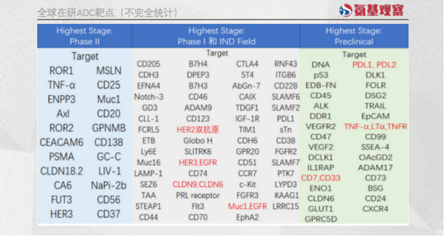 這在ADC領域展現的淋漓盡致。除了熱門的HER2等靶點外,ADC藥物的研發還覆蓋諸多潛力藍海靶點。如下圖所示,包括ROR1等靶點都進入即將被驗證階段,處於爆發前夕。