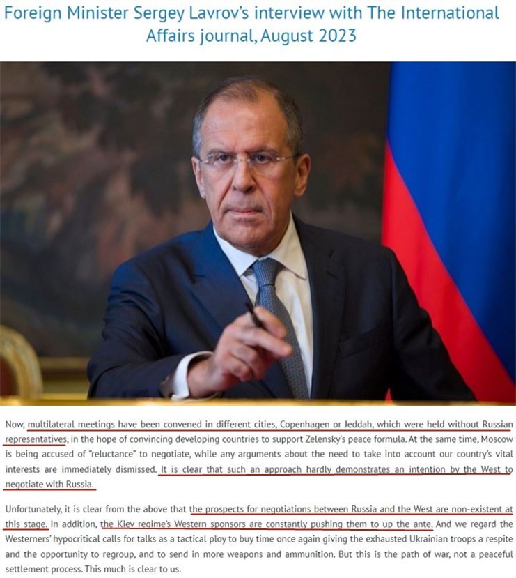 俄羅斯外長拉夫羅夫在8月19日出版的《國際事務》雜誌上表示,西方支持者不斷推動烏克蘭提高賭注,現在俄羅斯和西方之間已經沒有就烏克蘭問題進行談判的前景,在沒有邀請俄羅斯參加的情況下舉行的吉達和哥本哈根烏克蘭問題多邊磋商表明,西方無意與莫斯科達成任何協議。