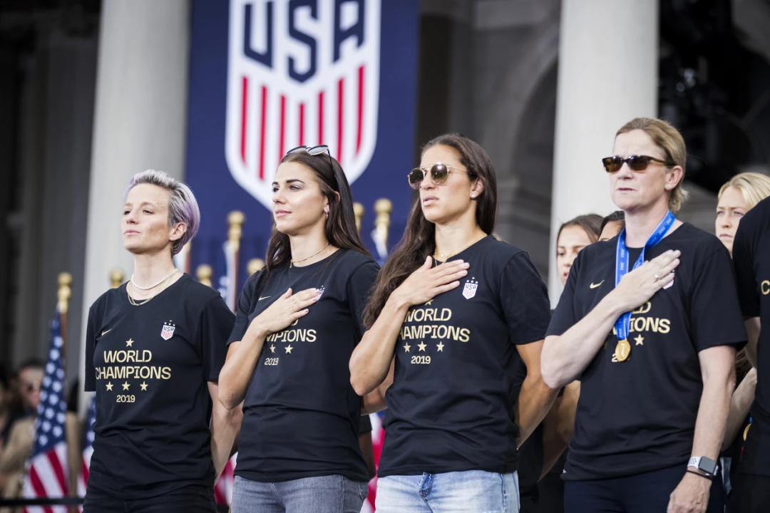 美國隊功勳隊長梅根·拉皮諾絕不會忘記2019年的那個夏夜——2019年7月7日,她們在世界盃決賽賽場上擊敗荷蘭隊,第四次問鼎世界之巔。在那一晚的看台上,爆發的不僅有歡呼聲,還有呼喊着“同工同酬(Equal Pay)!”的巨大聲浪。賽後採訪中,拉皮諾驕傲地説:“我想我們做到了,我們證明了我們和男足有一樣的市場價值,我們值得同工同酬。”