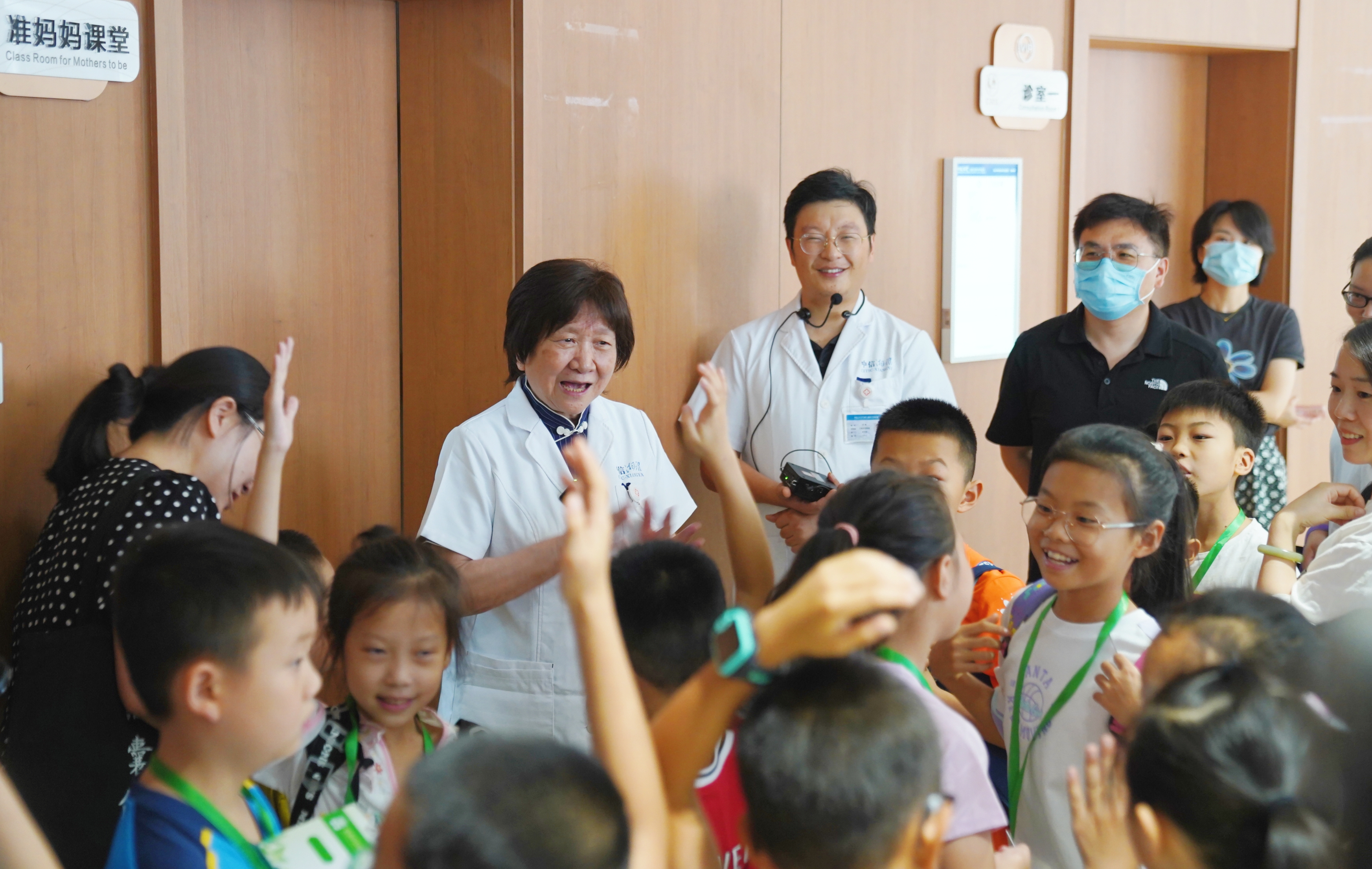(“走進中信”生命科學教育實踐活動中,盧光琇與來醫院參觀的學生見面、打招呼)