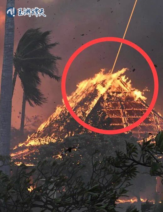 譚主注意到,過去幾天,社交媒體上還流傳着這樣一張照片:一束激光打下來,點燃了夏威夷的房屋。有網友提出,夏威夷的大火會不會就是由美軍自己點燃的?