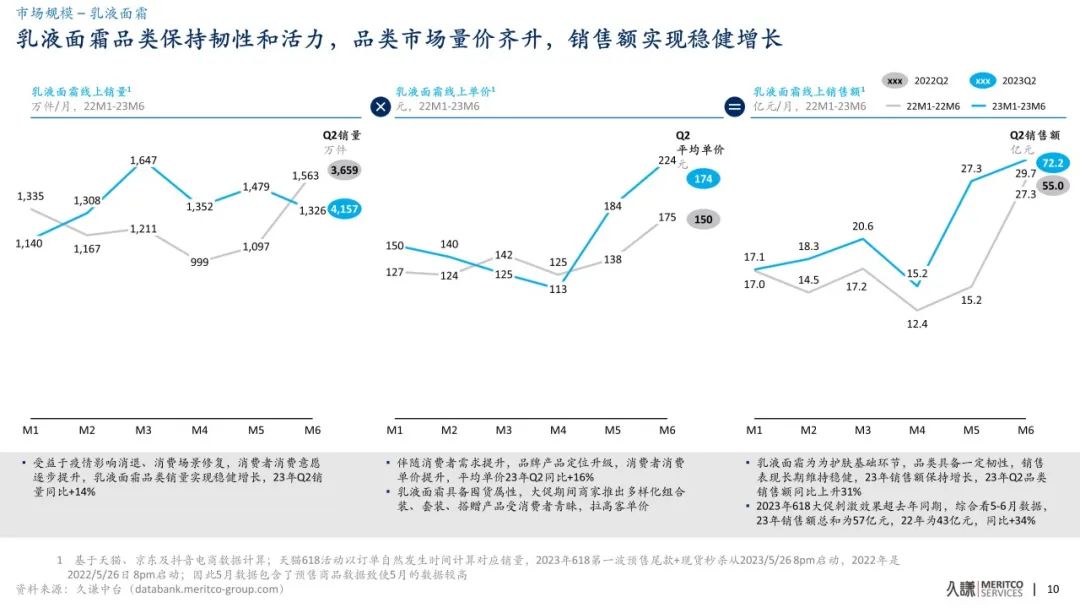 受益於疫情影響消退、消費場景修復,消費者消費意願逐步提升,乳液麪霜為為護膚基礎環節,品類具備一定韌性,銷售表現長期維持穩健,23年保持增長(23年Q2線上銷量同比+14% 、銷售額同比+31%),23M1起銷售額均超過去年同期