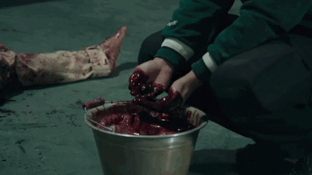 女嘉賓抬頭,眼白翻轉,鮮血糊住半張臉,毫無理智可言。