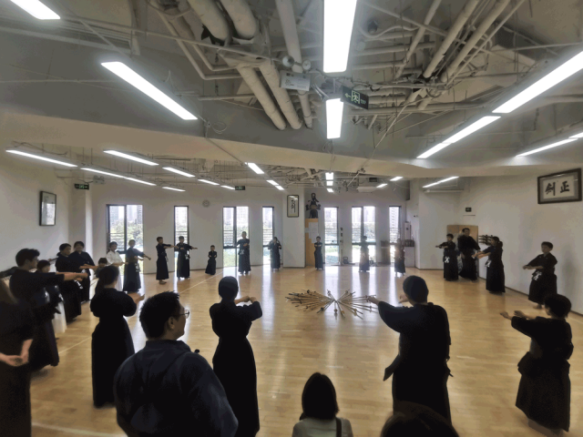 出了電梯,果然這一層的某一個方位傳來連續不斷的、洪亮的聲響,循着聲音,「正劍館」的牌子出現在眼前。玻璃門內,一塊不大的地方有約8人穿着深藍色的長袍揮舞手中的竹劍,合金面罩下,無法分清是誰在吼叫。竹劍落下,發出噼啪脆響,腳步踏在地板上,發出咚咚的聲音。