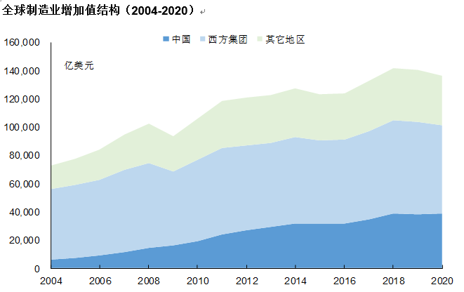 2020年,以G7為核心的西方集團是全球最大的製造業集團,貢獻了全球46.6%的製造業增加值。