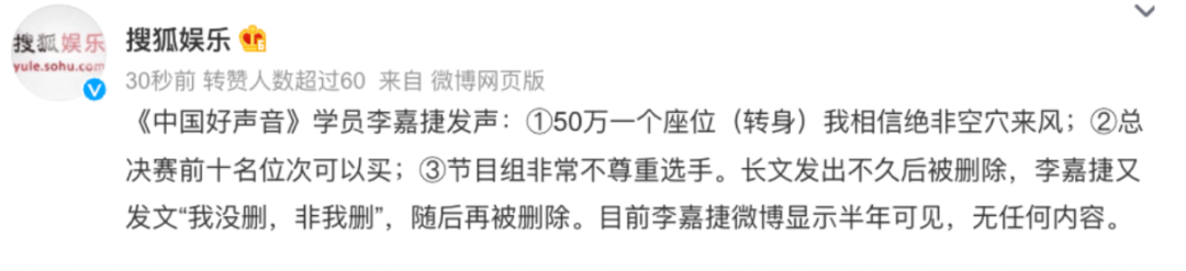 錄音被爆出的當天,曾參加過節目的選手李嘉捷發文揭露“50萬一個席位絕非空穴來風,總決賽前十名可以買”,緊接着“被刪博文”。