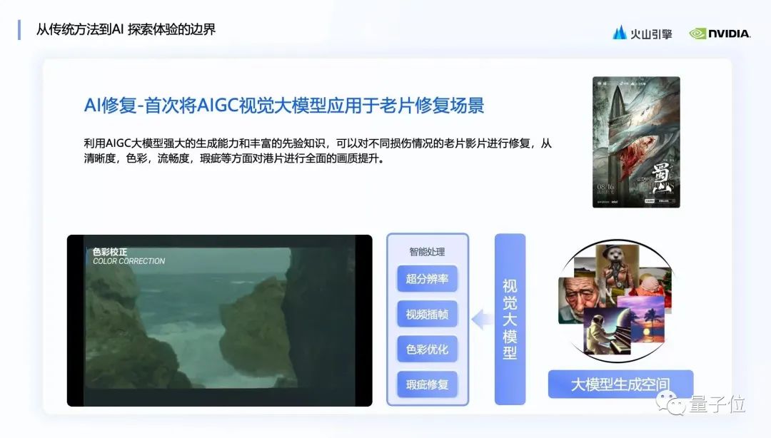 在突破體驗邊界方面,隨着大模型等AI技術的發展和賦能,我們也確實看到了很多有説服力的成果和樂觀的前景,比如「AI修復 」技術。上週,抖音、中國電影資料館、火山引擎發佈了“再續時光-經典香港電影修復計劃”, 我們首次將AIGC視覺大模型應用於老片修復場景。充分利用AIGC大模型強大的生成能力和豐富的先驗知識,對經典老片進行全面的畫質提升。