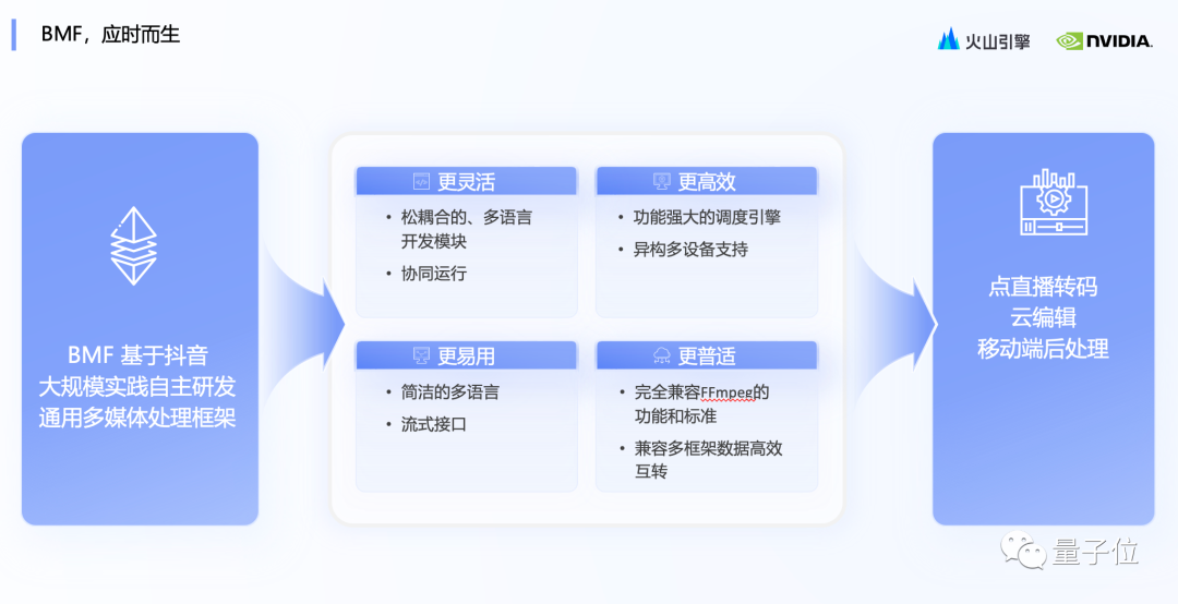 接下來我會介紹火山引擎視頻雲在這一領域所做的探索實踐,同時把我們聯合NVIDIA開源的多媒體處理框架BMF(Babit Multi-Media Framework)介紹給大家,這也是國內首個開源的同類項目,希望對整個行業起到普惠作用,助力加速視頻化新進程。