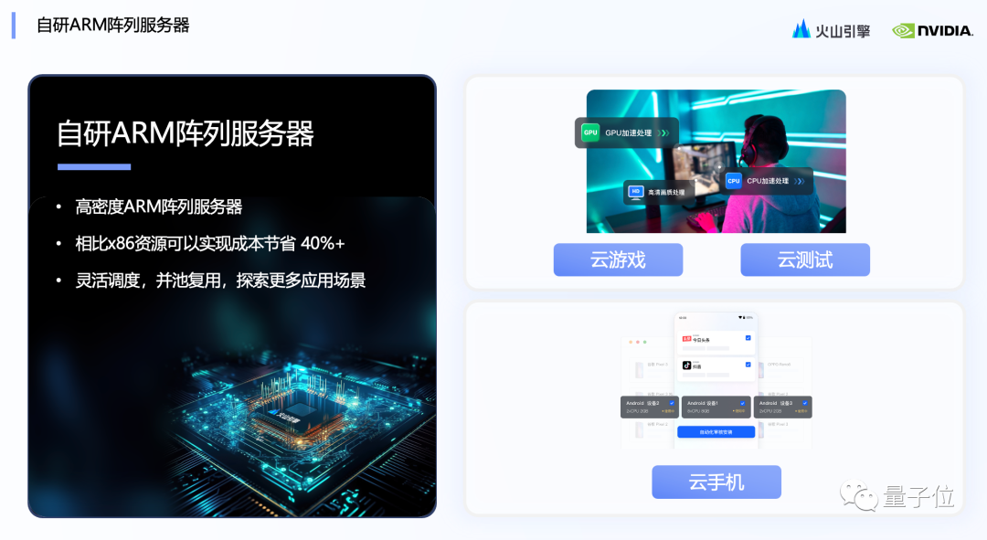 此外,火山引擎視頻雲還有ARM板卡陣列,這個方案本來是用來支持雲遊戲、雲手機等場景需求而研發的。我們把編轉碼和處理引擎在ARM指令集上深度集成和優化之後,經過大規模實測,發現這種算力資源在密度、成本方面相較x86服務器也有很大優勢。因此,我們也在點播場景裏不斷提升這種資源的使用量,並做到了與雲遊戲等場景的並池降本。我們這個方案也在不斷地迭代與演進,相信對於視頻應用的智能升級也將發揮重要的作用。