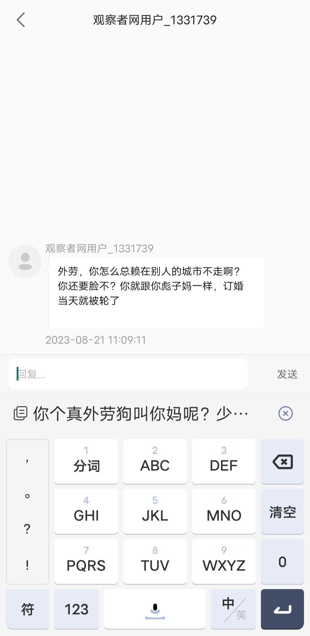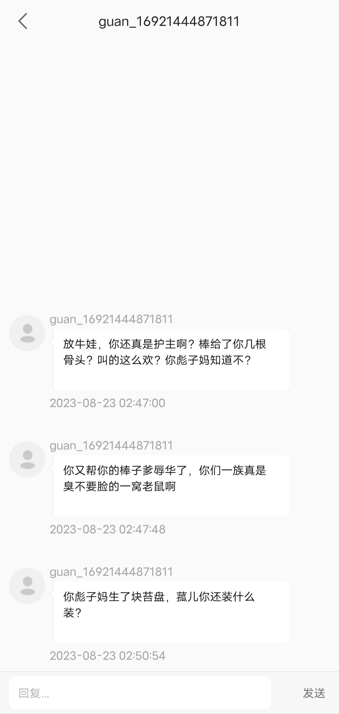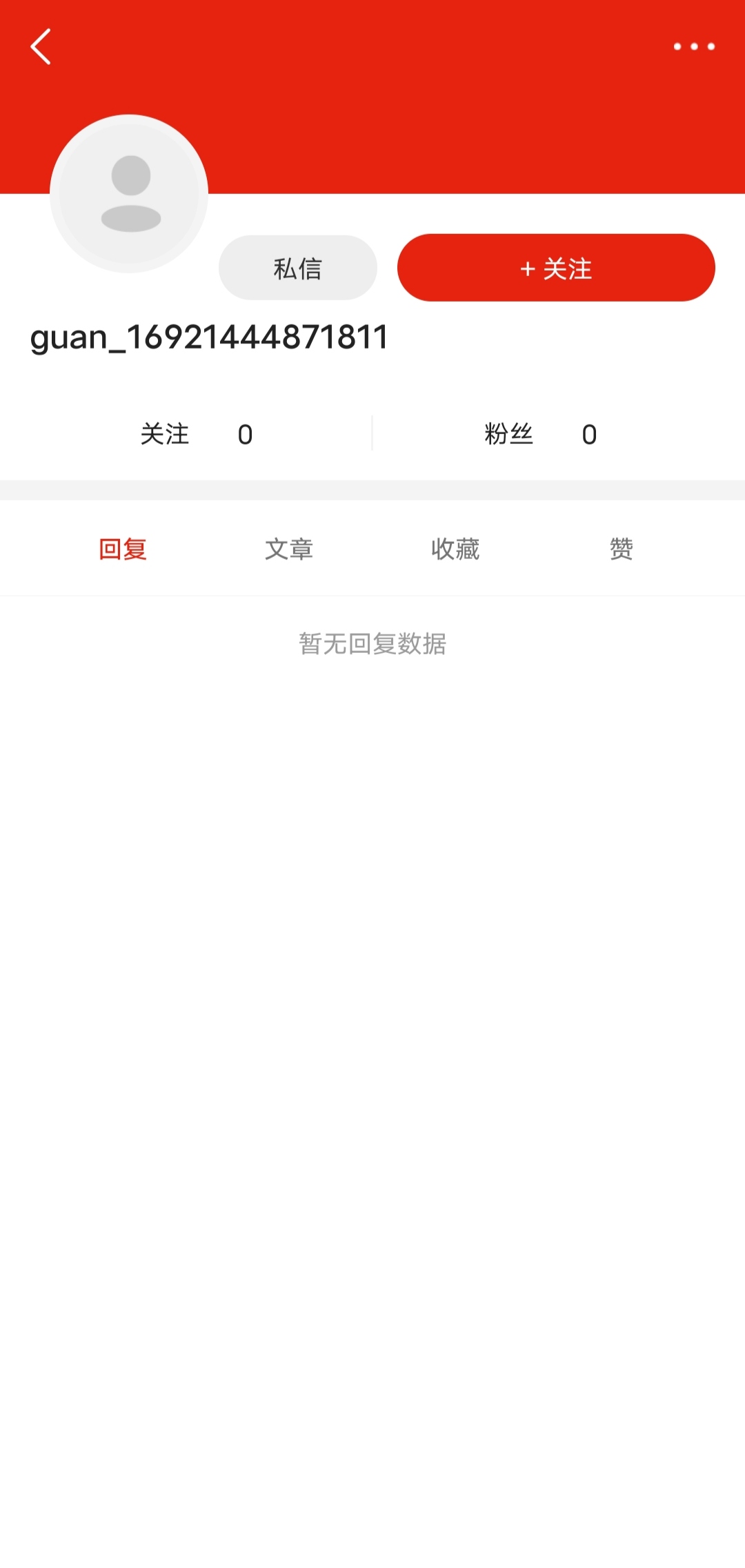 2反思券用完了我沒問題,界面又沒有舉報選項,那我肯定就要開始加特林式反擊啦ԅ(¯ㅂ¯ԅ)!結果等我文思如泉湧的垃圾話編輯好了點擊發送時,系統拉住了我,顯示對方賬號不正常發送失敗,美好的興致瞬間就軟了。然後點擊對方頭像,發現是個無評論無回覆無關注的三無號,再結合對方ID都是數字,肯定是新註冊的。再再結合他罵人的內容,發現捅了男女對立的窩子。再再再一番探索,推測是我的某個評論被掛到了微博上,然後博主極端粉絲跑過來註冊新號私信罵人。因為如果是老用户不會評論回覆關注全無,如果是老用户被系統制裁了導致的全無,那我這個普通網友沒那麼大能量,他肯定是私信罵了大量不同意見的人被封的。(還一種可能是對方拉黑我導致我看不到,但我沒這方面經驗,如果是這種那我提醒他趕緊回家,快的話還能嘗一口他木琴熱乎的骨灰拌飯,去晚了棺材板都被他野爹拿去衝浪了)