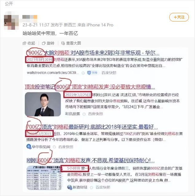 8月21日,微博上,一位投資者對頂流基金經理劉格菘的調侃引發關注,其發文稱,哈哈哈笑中帶淚,一年百億。