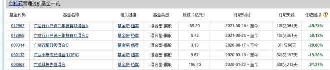截至8月21日,其管理時間最短的廣發行業嚴選三年混合A/C分別跌32.2%、32.4%;廣發雙擎升級混合A/C分別跌30.5%、30.7%;廣發小盤成長混合A/C分別跌28.38%、28.56%;廣發科技先鋒混合跌29.6%;廣發多元新興股票跌25.9%;廣發創新升級混合跌28.7%。
