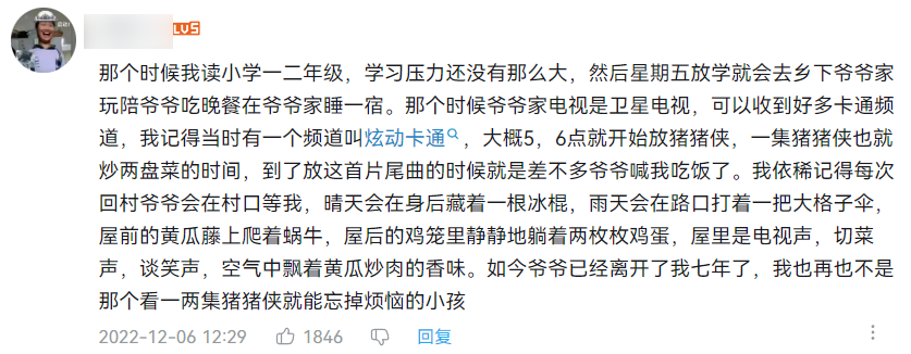 還有人回憶着小學時代的點點滴滴,村口等他的爺爺,黃瓜炒肉的香味,屋後的雞籠,看一兩集豬豬俠就能忘掉煩惱的小孩。