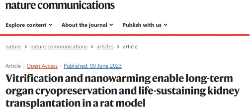 2023年6月,《自然通訊》雜誌上刊登了一篇名為《通過玻璃化冷凍及納米加熱在老鼠身上實現長期的腎臟保存和移植》的學術論文。作者是美國明尼蘇達大學的研究人員。