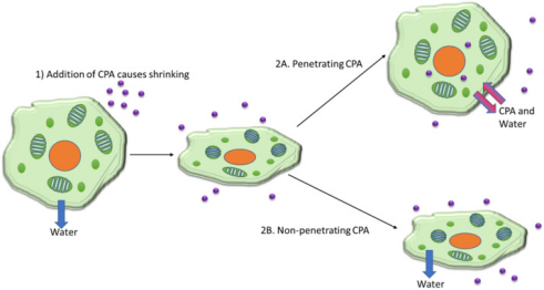 當置於高濃度保護劑中的細胞的細胞液與保護劑達到動態平衡後,細胞體積會因脱水而縮減30-50%。之後,將其置入液氮中使其瞬間玻璃化。