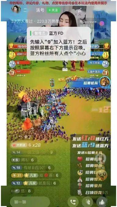 《兵臨城下》之所以能取得這樣的效果,關鍵在於給予玩家高互動感。在《兵臨城下》中,通過創新遊戲機制,玩家可以參加紅藍陣營中的一隊,並通過點贊刷禮物等方式招募軍隊,讓玩家在直播中找到參與感。