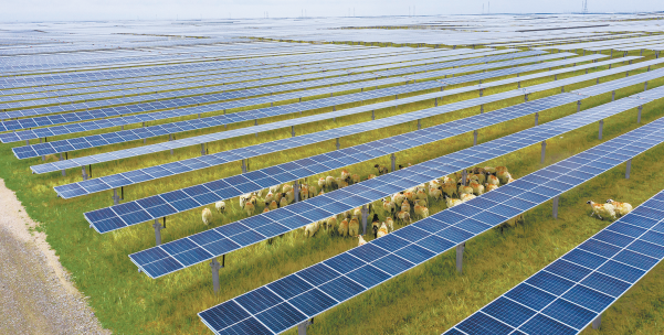 光伏板下與種草、放羊結合起來,養殖、固沙兩不誤,沖刷光伏板的水正好流到地面澆灌。如果在設計的時候就考慮好,不沿着板沿自然滴落,而是在板下做一個分佈板,把水均勻地灑向板下地面,效果會更好。