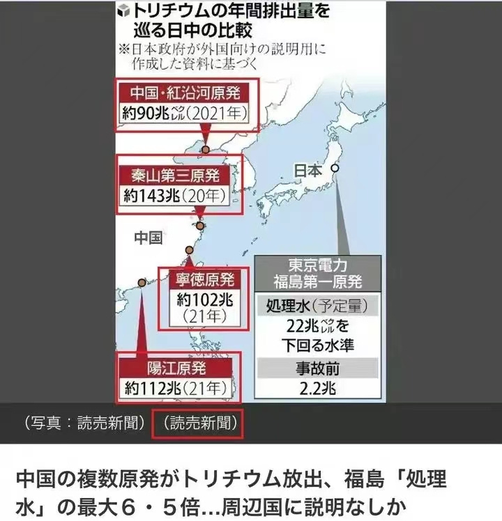 為了增加所謂“合理性”,日本內閣官房長官松野博一聲稱,日方排放氚的濃度標準,遠遠嚴於中韓等國。日本《讀賣新聞》6月23日刊載了一則報道,説中國多個核電站排放的氚要遠超日本福島核電站。真是信口雌黃!