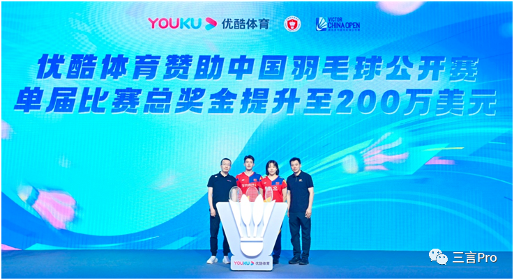 8月15日,優酷體育與中國羽毛球協會媒體合作,暨中國羽毛球公開賽2023-2026週期合作發佈會在北京舉辦。優酷宣佈,未來四年贊助中國羽毛球公開賽300萬美元,助其每年獎金達到200萬美元,成為獎金最高的超級1000級別賽事。