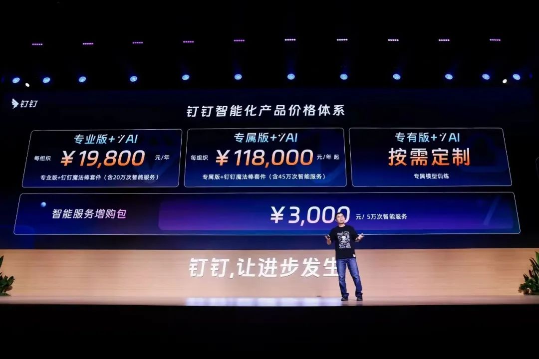 企業購買了年費9800元的釘釘專業版後,每年增加10000元即可獲得20萬次大模型調用額度;購買了每年約10萬元的釘釘專屬版後,每年增加20000元即可獲得45萬次大模型調用額度。釘釘還提供3000元一個的智能服務增購包,客户在購買後可以調用5萬次大模型。