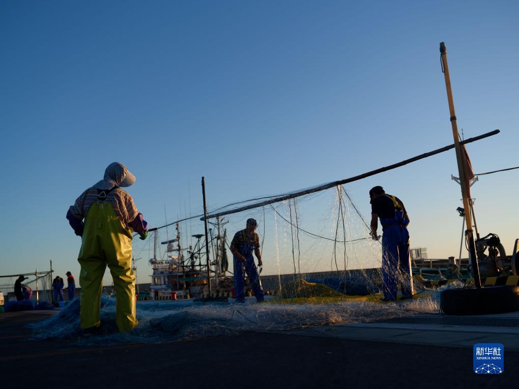 8月23日,捕魚歸來的漁民在日本福島縣新地町的漁港晾曬漁網。新華社記者 張笑宇 攝