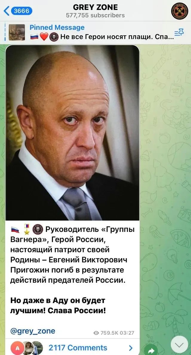 瓦格納電報頻道“灰色地帶”(grey zone)發文稱:“瓦格納集團的領導人、俄羅斯英雄、祖國的真正愛國者葉夫根尼·維克托羅維奇·普里戈任死於俄羅斯叛徒的行徑。但即使在地獄,他也將是最好的!榮耀屬於俄羅斯!”