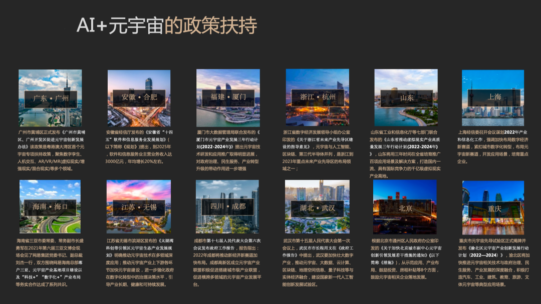 這張圖我總結出來叫“A30B115”,我們現在有30個城市,給予AI、元宇宙這樣的新興科技產業100億,在2023~2025年100億以上的扶持政策,像成都單一城市給到500億,另外115個城市給到了一年20億的扶持政策,去扶持這個產業,這應該是針對這個行業,給到最大的扶持力度。