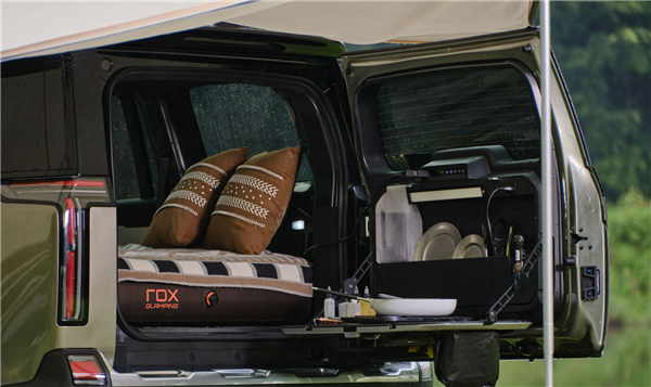 打尾門餐廚系統裏,可容納全套户外餐廚用具;2.2千瓦對外放電,支持電池爐、空氣炸鍋等電器。
