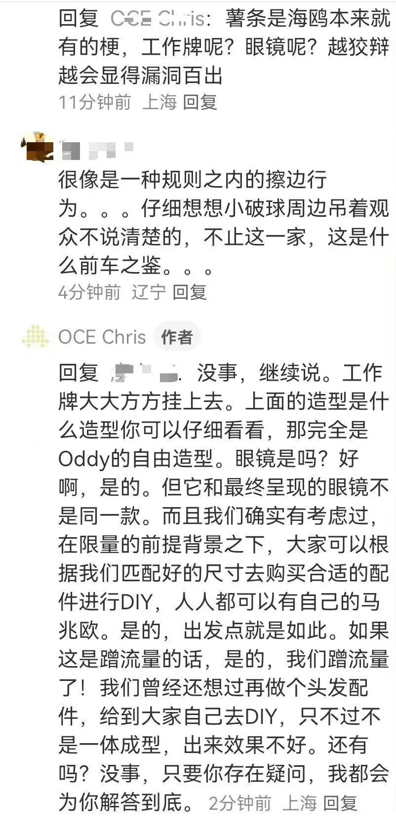 並未等來期待已久的發售價格和渠道信息,失望情緒在粉絲間蔓延。有人猜測合作未成是由於馬兆鷗形象的版權歸屬難以界定,也有不少人認為OCE半年的鋪墊屬於“浪費感情”,“無法量產售賣”如此關鍵的信息,官方卻不提前告知。