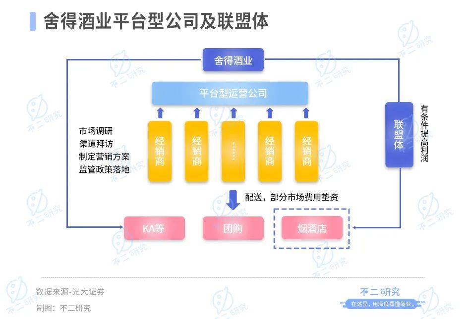 2020年至今,隨着天洋系退場,原捨得元老迴歸。在復星系進駐後,捨得酒業在原“1+1”渠道的基礎上,通過平台型、經銷商聯盟、KOL、直銷四種模式共同推近捨得酒業渠道模式。