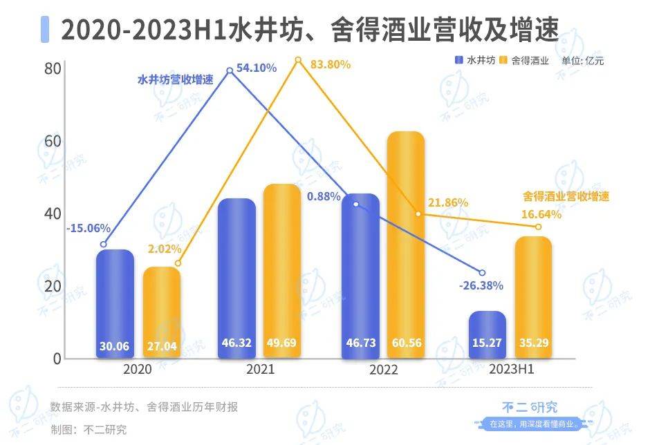 「不二研究」據兩者的半年報發現:今年上半年,水井坊、捨得酒業的營收分別為15.27億元和35.29億元;營收增速分別為-26.38%、16.64%。