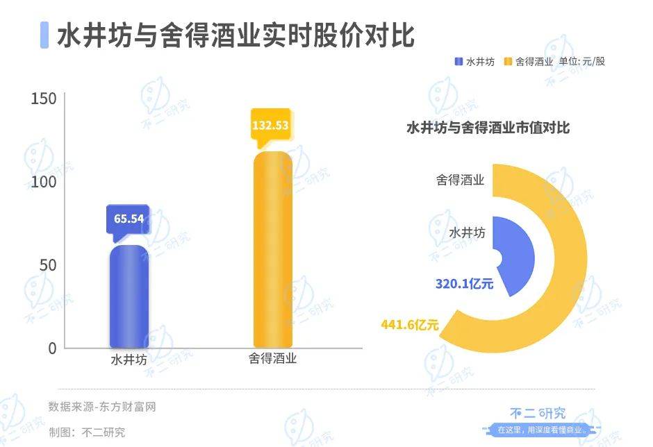 截至8月23日收盤,水井坊報收65.54元/股,對應市值320.1億元;捨得酒業報收132.53元/股,對應市值441.6億元。