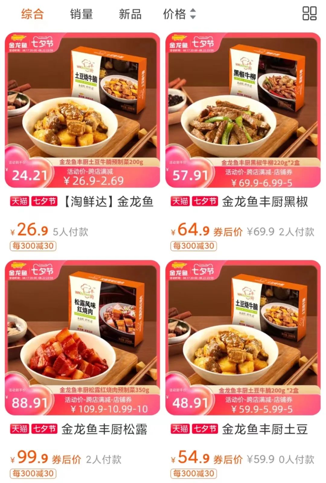 回到金龍魚上市的預製菜。目前,在天貓、京東等線上銷售平台可見的金龍魚品牌預製菜銷量堪稱慘淡。也許如金龍魚所説,其預製菜目前剛剛開局,未來可期。