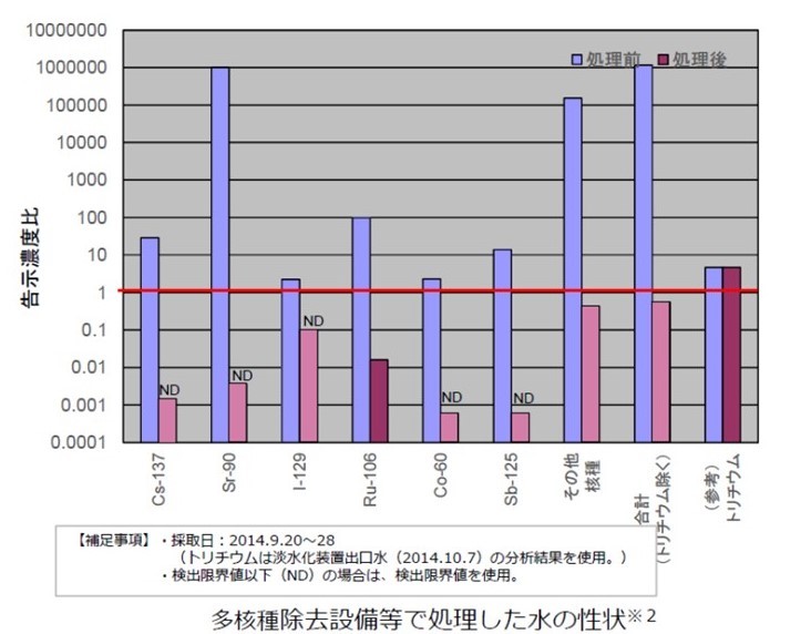 專家們對氚的影響存在意見分歧。 日本政府強調其安全性,稱一張紙即可阻擋氚輻射,而且氚的性質與水相同,因此尚未證實會在人體或生物體中蓄積。