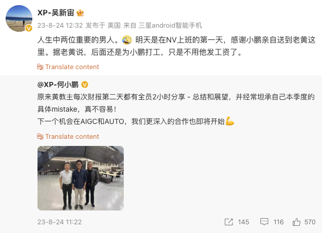 8月24日,小鵬汽車CEO何小鵬在微博曬出與小鵬汽車自動駕駛副總裁吳新宙和英偉達CEO黃仁勳的合照,並稱與英偉達更深入的合作即將開始。隨後,吳新宙轉發這一微博,並確認將離職加入英偉達。(界面)