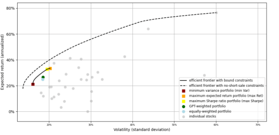 在得到了兩種不同的投資組合,即一般的等權組合,和GPT-4自己選的加權組合後,研究人員會根據投資組合優化的算法,計算這兩種股票組合的收益和風險。