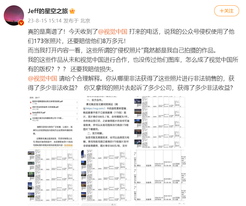 8月15日下午,星空攝影師戴建峯在微博爆料,自己在公眾號上用自己拍攝的照片,卻被視覺中國以侵權為由索賠8萬多元,更蹊蹺的是,他從未將這些照片上傳過視覺中國的圖庫。他直呼“離譜”。