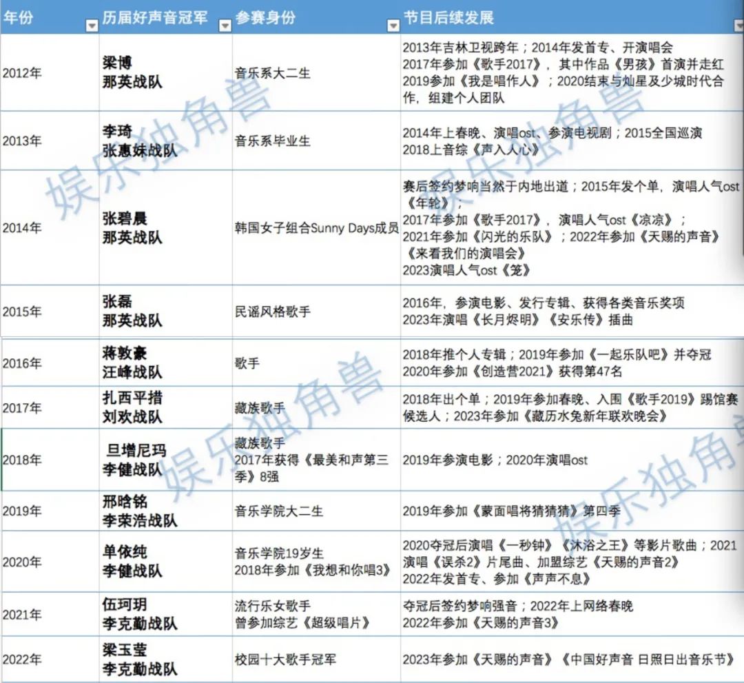 《好聲音》作為華語樂壇最頭部的選秀類音綜,很快顯現出它的兩面性。**一方面,它的確實實在在為華語樂壇輸送了新鮮血液。**娛樂獨角獸統計發現,歷屆冠軍基本上都在獲得冠軍後的同年或後兩年內,拿下過新人類音樂獎項或成功入圍。他們中的相當一部分,也曾登上門檻頗高的《歌手》舞台,作為常駐或踢館嘉賓。