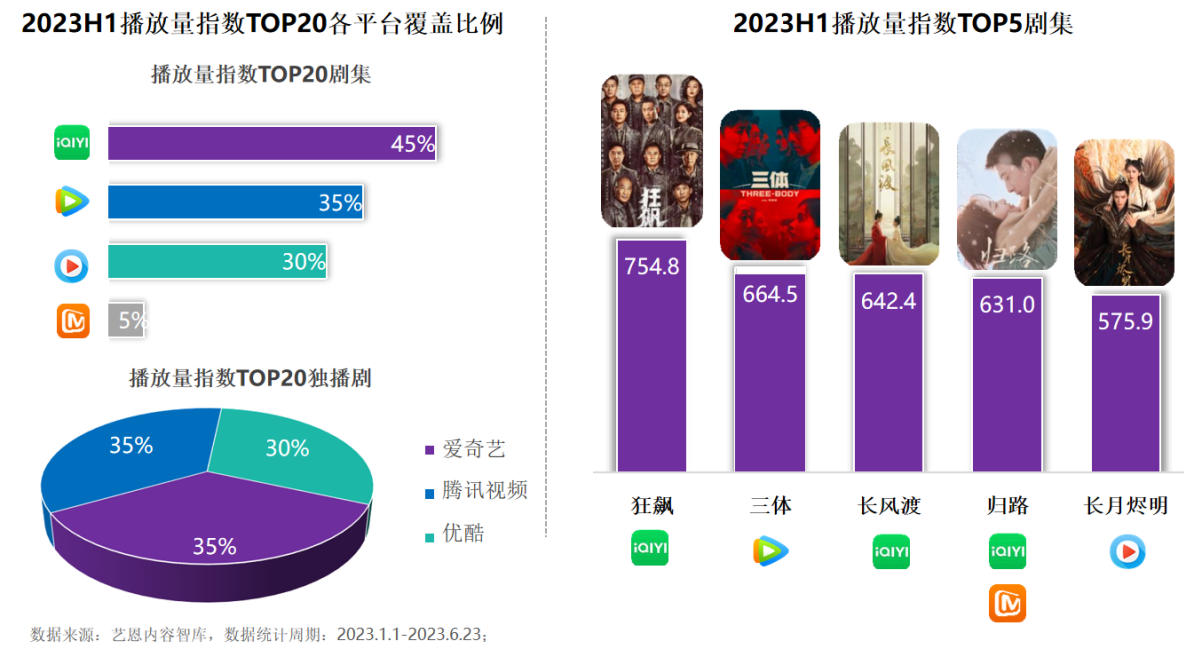 總體上,藝恩數據《2023H1國產劇市場及趨勢研究報告》顯示,愛奇藝貢獻了2023上半年播放量指數TOP20劇集中的近一半,這在國內四大主流視頻流媒體平台中穩居第一——TOP20中35%為愛奇藝獨播,強化了用户對平台的心智記憶。