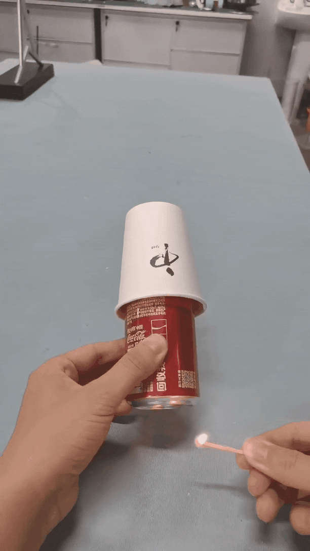 由於我們覆蓋紙杯並壓緊邊緣,相當於創造了一個相對密封的空間,點火時易拉罐內壓強急劇增大,罐內氣體就會從壓強最小的地方,也就是蓋上紙杯的易拉罐拉環口快速噴出,衝擊紙杯,表現為紙杯快速向前發射。