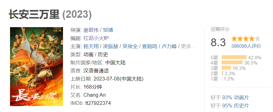 為什麼説它是類似於春晚的電影?因為《長安三萬裏》從題材上來説,講的是大多數接受過基本小學教育就都耳熟能詳的唐詩,講的是盛唐傳奇李白,這就要求了,你一定不能瞎編,一定不能胡改,必須要按照觀眾熟悉的那個李白形象來講故事,否則觀眾口水能淹死你。