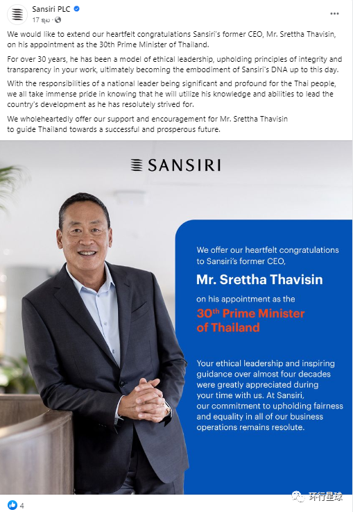這位身高1.92米,步入政壇僅175天的新總理,就在半年前,泰國人對他的印象還是房地產大亨、尚思睿(Sansiri)的老闆。