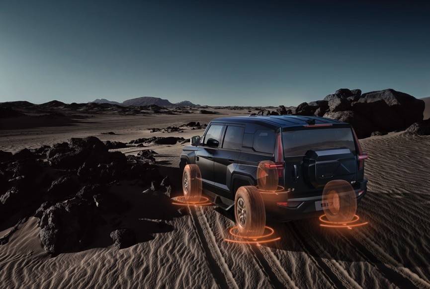 猛士917純電版,輪邊扭矩超過16200牛米,馬力高達1088匹,零百加速僅需4.2秒,輕鬆實現100%爬坡度,CLTC綜合續航達到505公里。這樣的參數,玩越野是真爽。